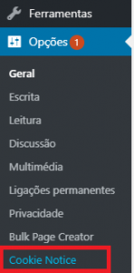 Para configurares o Cookie Notice podes aceder no backoffice em Opções > Cookie Notice.
